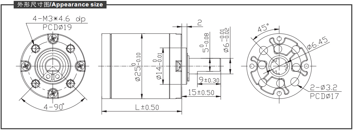 輸出軸直徑為Φ6.0mm,長(zhǎng)度可根據(jù)客戶要求定制