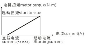這是電機(jī)的第二個(gè)重要特性,電流和電機(jī)扭矩呈線性關(guān)系,用來(lái)計(jì)算空載電流和轉(zhuǎn)子靜止時(shí)的電流(起動(dòng)電流)。關(guān)系圖中并未隨著電機(jī)供電電壓而變化。曲線終點(diǎn)的延長(zhǎng)線和扭矩,起始電流相一致,曲線的斜率被稱作電機(jī)的扭矩常數(shù)。